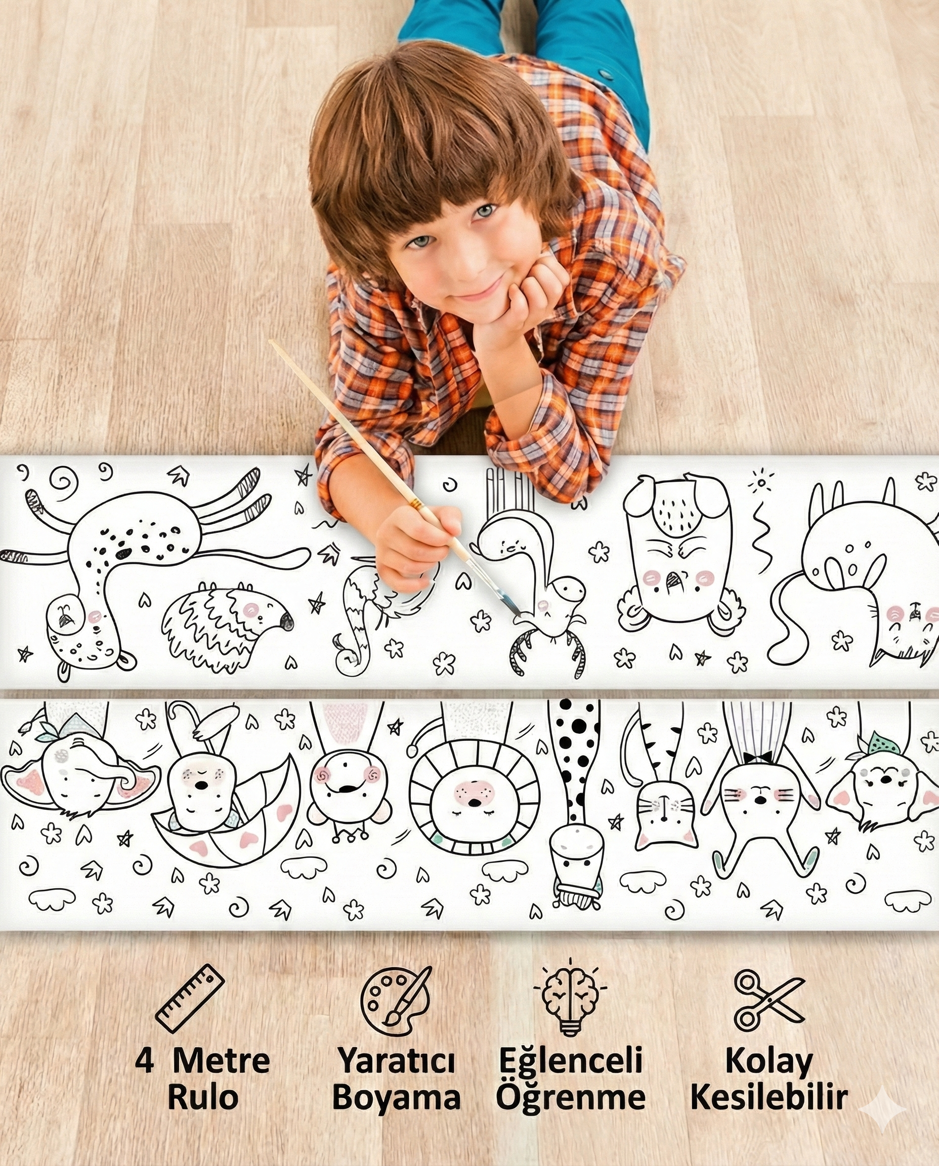Duvarları ve halıları korurken, sevdiklerinizin bitmeyen enerjisi sizi yoruyor mu? MoovaKids'in 3.75 metrelik dev rulosu, masaya veya yere serilerek saatlerce süren, lekesiz bir sanat alanı sunuyor. Onların hayal gücü genişlesin, sizin de içiniz rahat etsin; bu renkli dünyayı hemen evinize buyur edin.